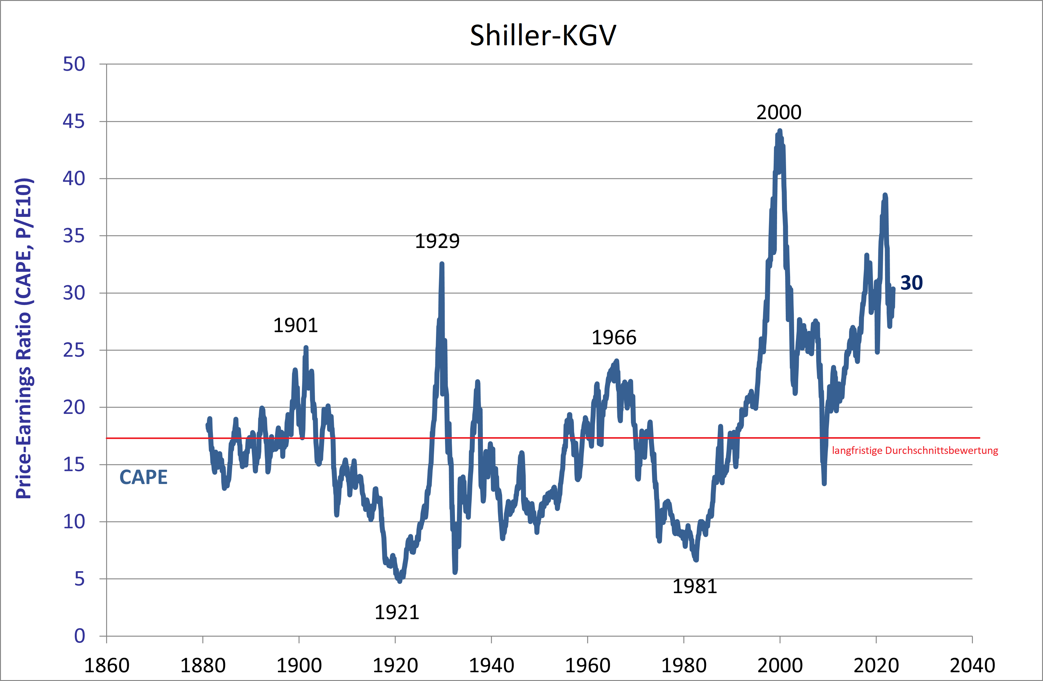 Das zyklisch bereinigte Kurs-Gewinn-Verhältnis nach Robert Shiller (CAPE) liegt im Juni 2025 bei etwa 30. Der historische Mittelwert seit 1881 liegt bei rund 17. Die aktuelle Abweichung deutet auf eine überdurchschnittliche Bewertung hin, insbesondere im S&P 500.